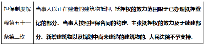 對此, 新出臺的《民法典》及最高人民法院關于適用《中華人民共和國民法典》有關擔保制度的解釋(以下簡稱“擔保制度解釋”)對此給出了確定的回答: 在建工程抵押權的效力不及于續建部分、新增建筑物以及規劃中尚未建造的建筑物。