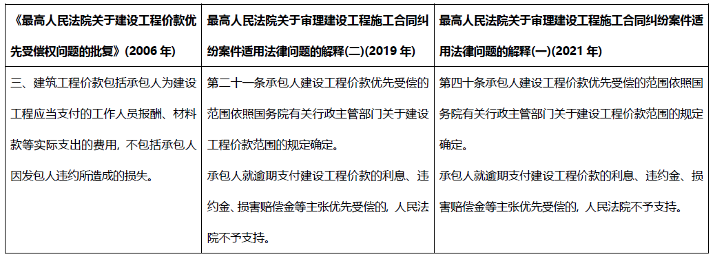 此外, 此前的《批復》、最高人民法院于2018年頒布、2019年實施的現已失效的關于審理建設工程施工合同糾紛案件適用法律問題的解釋(二)(以下簡稱“已失效建設工程合同解釋”)與現在的《建設工程合同解釋一》均明確將逾期支付建設工程價款的違約責任排除在優先受償的范圍之外, 因此, 金融機構作為抵押權人更應當關注的是承包人主張的工程價款是否包含了利息、違約金、損害賠償金等不屬于工程支出的費用。