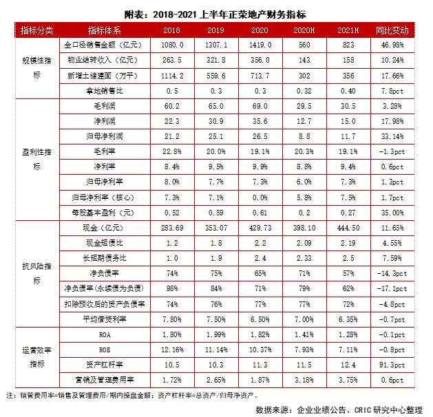 2021上半年正榮實現營業總收入160.11億元,同比增長10.1%,其中開發結轉收入157.64億元,同比增長10.24%,主要由于中西部結轉大幅增長所致。隨著近年銷售規模的穩增長,預收賬款較期初明顯增長31.28%至799.05億元,對2020全年開發收入的覆蓋倍數提升至2.24,為后續營業收入的結轉提供有效保障。