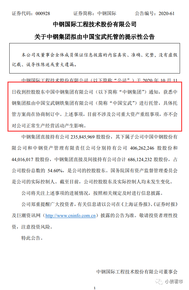 10月11日晚,中鋼國際(000928.SZ)和中鋼天源(002057.SZ)公告稱,公司于當日收到控股股東中國中鋼集團有限公司(以下簡稱“中鋼集團”)通知,獲悉中鋼集團擬由寶武集團進行托管,但目前具體托管方案尚在協商制訂中。