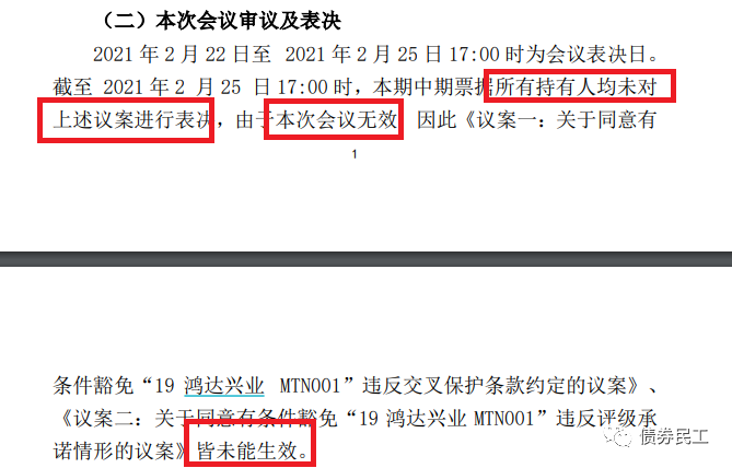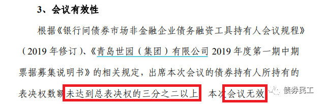 公告,“”2021年第一次持有人會議,所有持有人均未對議案進行表決,會議無效。從實踐來看,這種所有持有人均為表決的情況也極為罕見。