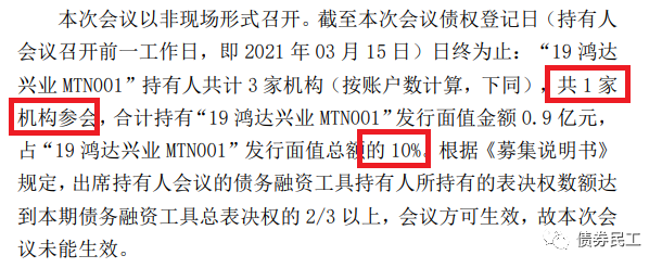 4、2021年3月16日,“”第一次持有人會議的持有人所持有的表決權數額未達到本期債務融資工具總表決權的三分之二以上,持有人會議無效。主承銷商在3月19日也公告,