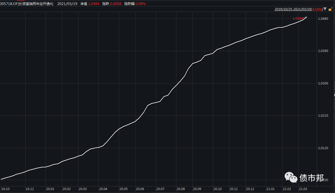 其次是剔除了采用攤余成本法估值的基金。很容易理解,采用攤余成本法基金凈值就是一條穩定向上的曲線,除非持倉出現違約等問題,產品凈值完全無法體現持倉凈值的波動,自然就無法體現基金經理的投資水平了。即使在去年3月利率低點時拿了一把長債,攤余成本法基金凈值依然是穩穩的幸福,走勢如下圖所示: