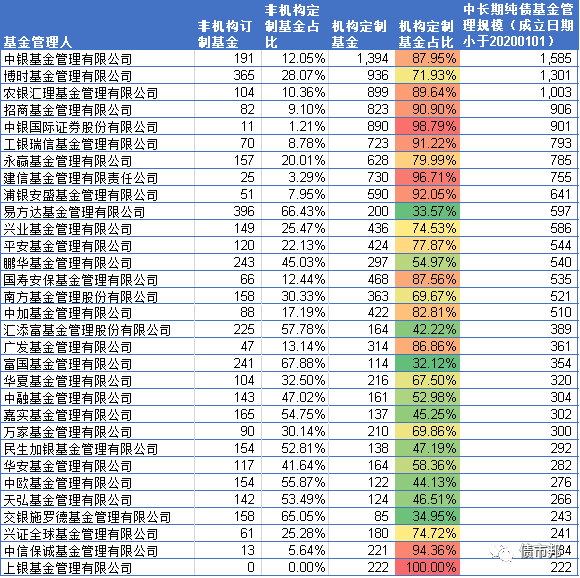 計算了下目前中長期純債基金管理規模在200億元以上的機構,非常可悲地看到,機構定制基金占比低于40%的,只有易方達、富國、交銀施羅德3家機構,中銀國際證券、工銀瑞信基金、建信基金、浦銀安盛等,產品完全淪為銀行的通道,機構定制基金的規模占比超過了90%。