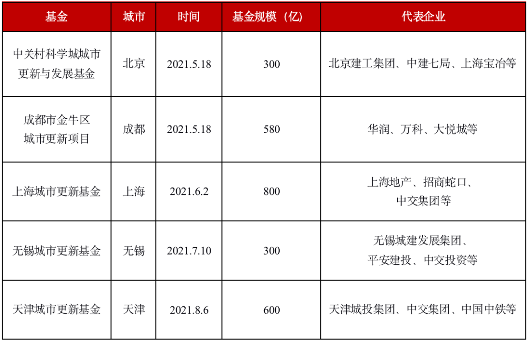 隨著各地土地市場由增量時代轉向存量時代,加上“十四五”規劃明確提出實施城市更新行動,城市更新成為各地政府與企業的工作重點。隨著各地城市更新熱潮不斷涌動,相關的配套政策與資金福利都在不斷落實中。近段時間以來,上海、天津、無錫等地相繼成立以地方國企牽頭的城市更新基金。