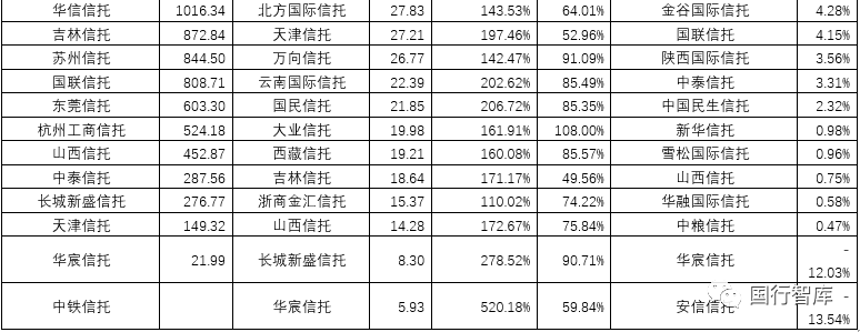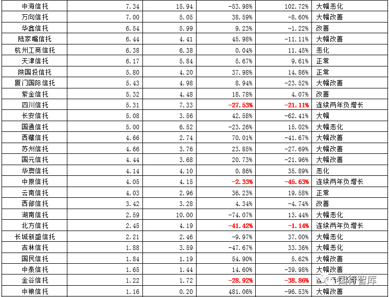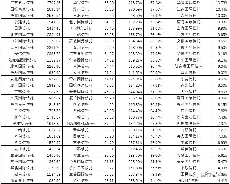 4、當(dāng)然也有一些信托公司的業(yè)績(jī)出現(xiàn)了明顯改善,如中糧信托(同比481.06%)、國(guó)聯(lián)信托(360.93%)、新華信托(241.30%)、西藏信托(70.01%)、英大信托(66.66%)、國(guó)投泰康信托(63.77%)、國(guó)民信托(54.90%)、陸家嘴信托(45.98%)、長(zhǎng)安信托(42.58%)、萬(wàn)向信托(38.59%)等等。