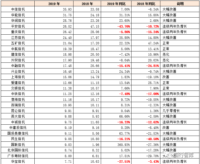 3、平安信托、重慶信托、中融信托、中鐵信托、中誠(chéng)信托、民生信托、華寶信托、四川信托、中原信托、北方信托、金谷信托、華信信托、華融信托等13家信托公司2018年與2019年連續(xù)兩年的凈利潤(rùn)均出現(xiàn)下降。