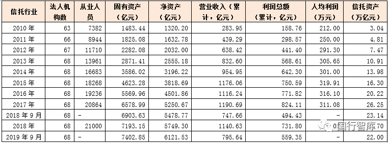 (3)雖然信托資產(chǎn)規(guī)模較高,但68家信托公司的自有資產(chǎn)(固有資產(chǎn))和凈資產(chǎn)卻分別僅為0.74萬(wàn)億和0.61萬(wàn)億,年均創(chuàng)造營(yíng)業(yè)收入和利潤(rùn)總額分別高達(dá)1200億元和700億元,人均利潤(rùn)更是高達(dá)300萬(wàn)元。