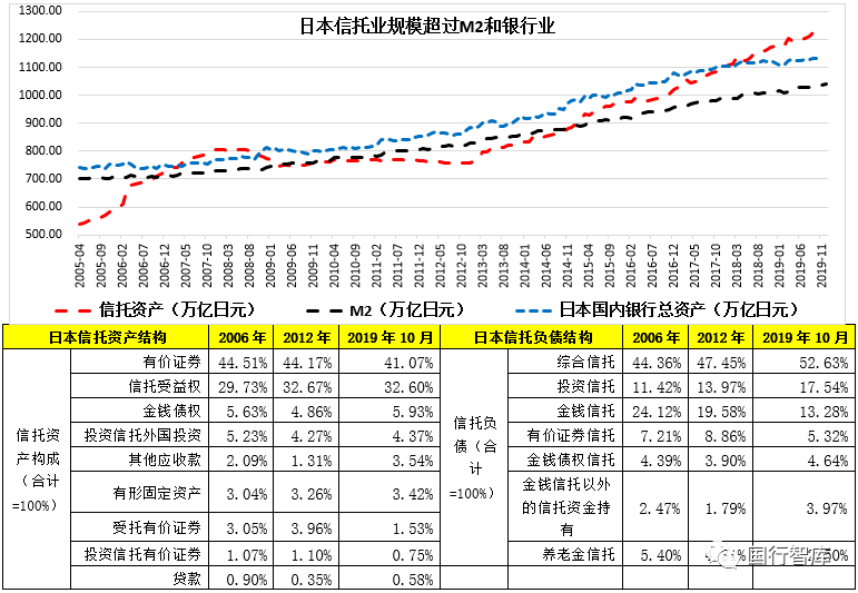 3、僅以日本為例,其信托業(yè)務(wù)主要以資金信托為主,業(yè)務(wù)范圍上和銀行相互補(bǔ)充。截至2019年10月,日本信托資產(chǎn)規(guī)模高達(dá)1227萬(wàn)億日元(約合190萬(wàn)億元人民幣),超過(guò)M2(1042萬(wàn)億日元),同時(shí)也超過(guò)銀行業(yè)總資產(chǎn)(1140萬(wàn)億日元)。要知道,2006年以前,日本的信托業(yè)規(guī)模還明顯低于銀行業(yè)和M2。