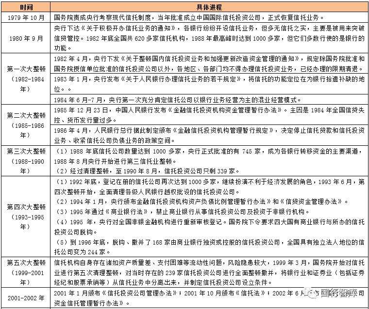 1、1979年與2001年是兩個(gè)關(guān)鍵的時(shí)間點(diǎn),1979年信托業(yè)務(wù)恢復(fù)、2001年我國(guó)信托法正式發(fā)布。不過(guò)在1982-2001年的近二十年時(shí)間里,我國(guó)信托公司的亂象非常突出,歷經(jīng)五次大整頓(分別為1982-1984年、1985-1986年、1988-1990年、1993-1995年、1999-2001年)。