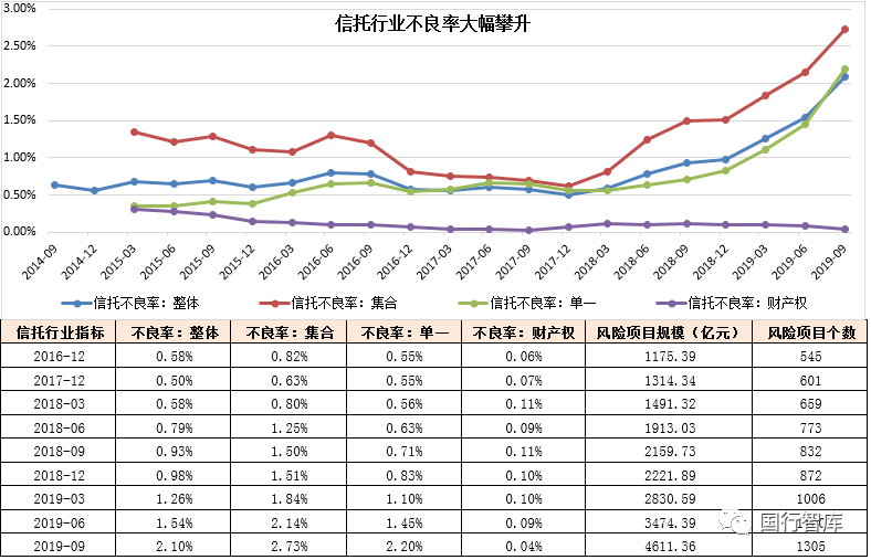 具體來(lái)看,截至2019年9月底,集合類(lèi)信托、單一類(lèi)信托和財(cái)產(chǎn)權(quán)信托的不良率分別為2.73%、2.20%和0.04%,特別是集合類(lèi)信托和單一類(lèi)信托的不良率分別較2019年6月底上升0.59個(gè)百分點(diǎn)和0.75個(gè)百分點(diǎn),項(xiàng)目質(zhì)量惡化趨勢(shì)非常明顯。