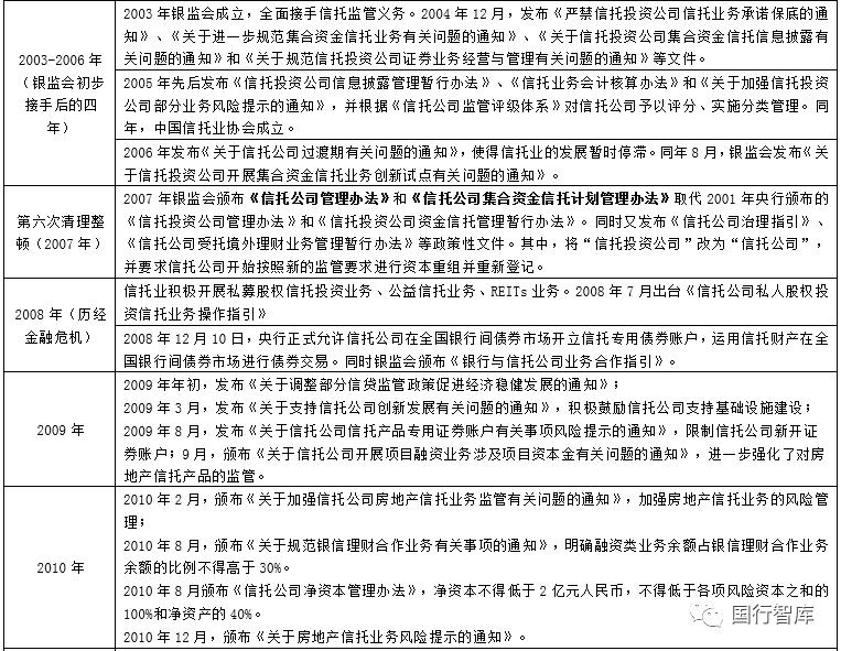應(yīng)該說(shuō),直至央行分別于2001年1月、2001年10月和2002年6月頒布《信托投資公司管理辦法》、《信托法》和《信托投資公司資金信托管理暫行辦法》以及2003年銀監(jiān)會(huì)正式成立,信托行業(yè)的五次大整頓才算告一段落,信托行業(yè)也正式從央行管轄期過(guò)渡至銀監(jiān)會(huì)管轄。