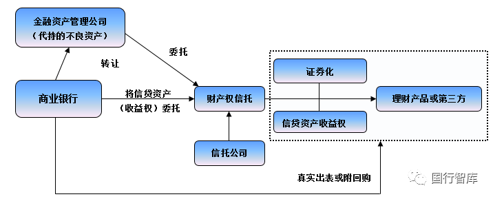 一是商業(yè)銀行將不良資產(chǎn)轉(zhuǎn)讓給AMC代持,而AMC將代持的不良資產(chǎn)委托給信托公司成立財(cái)產(chǎn)權(quán)信托,形成信托收益權(quán),并由商業(yè)銀行負(fù)責(zé)不良資產(chǎn)的處置清收工作(商業(yè)銀行承諾回購(gòu)信托收益權(quán))。