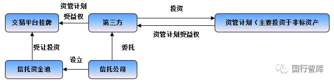 該模式主要有信托公司委托第三方去投資一個(gè)底層資產(chǎn)為非標(biāo)的資管計(jì)劃(同時(shí)再設(shè)立一個(gè)信托資金池),隨后第三方將上述資管計(jì)劃受益權(quán)在北金所、銀登等交易平臺(tái)掛牌,最后信托公司通過(guò)信托資金池去摘牌。考慮到該模式由于是通過(guò)協(xié)議轉(zhuǎn)讓的方式完成對(duì)接,因此呈現(xiàn)沒(méi)有流動(dòng)性、價(jià)值不公允以及底層資產(chǎn)不清晰等特征,仍然屬于資金池業(yè)務(wù)。