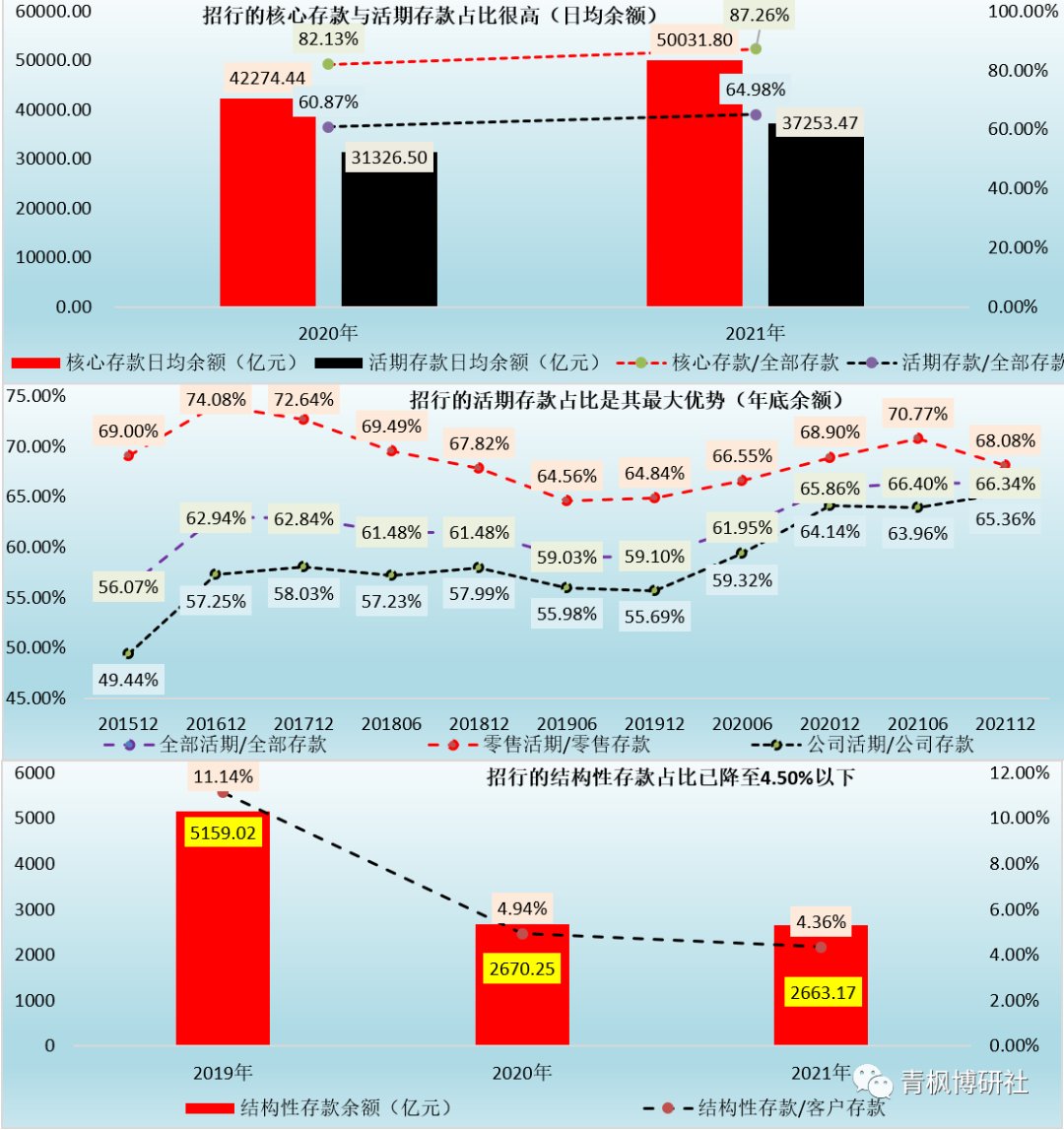 2、核心存款是招行的內部考核指標,主要指剔除大額存單、結構性存款等成本較高的存款。事實上持續擴大客群規模、壓降或對高成本存款或進行量價管控以優化存款結構、應對存款成本剛性上升壓力也是招行2020年以來的主要任務。2021年,招行的核心存款日均余額達到50031.80億元,同比大幅增長18.92%,占客戶存款日均余額的比例更是高達87.26%(較2020年大幅提升 5.13個百分點)。這意味著,對于招行而言,高成本存款占比已不到13%。