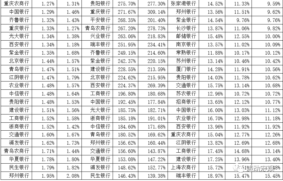 1、以不良貸款率來看,有10家銀行的不良貸款率低于1%,從低到高依次為寧波銀行(0.78%)、常熟銀行(0.81%)、郵儲銀行(0.82%)、杭州銀行(0.90%)、上海農商行(0.90%)、南京銀行(0.91%)、廈門銀行(0.92%)、招商銀行(0.93%)、無錫銀行(0.93%)、張家港銀行(0.94%)。