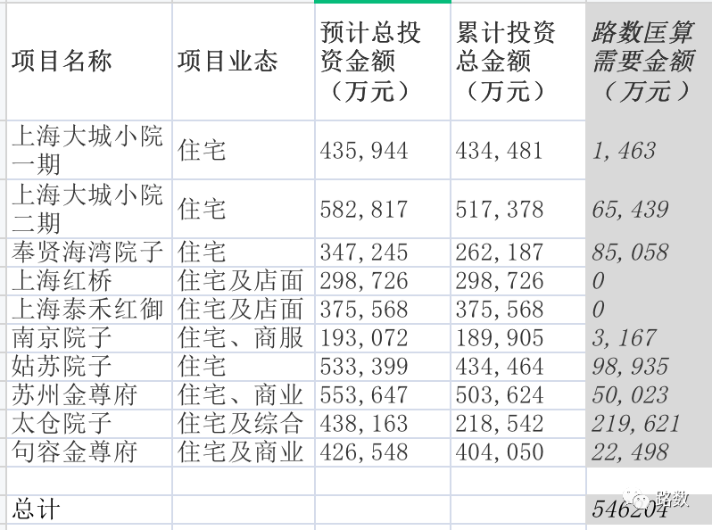 按照表格所列項(xiàng)目初步匡算,泰禾在上海和蘇州的7個(gè)項(xiàng)目到交付時(shí)所需要的資金總計(jì)約54億。(隨著工期延長等,利息不斷資本化,實(shí)際的投入也會(huì)增加)