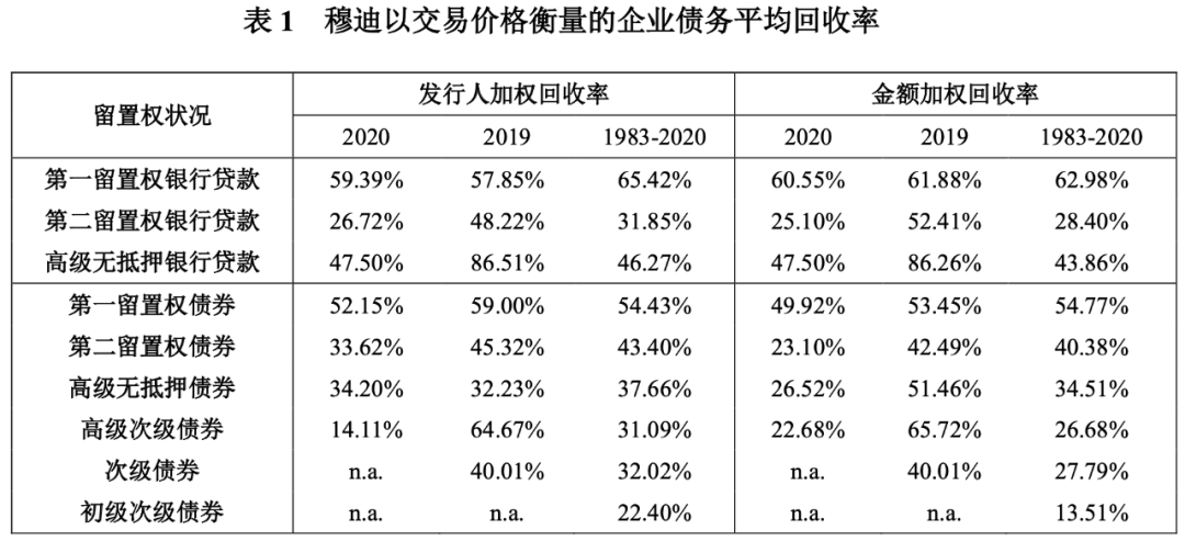 國際三大評級機構對違約回收率的披露情況方面,穆迪的公開披露信息最為充分。穆迪在年度違約和回收率報告中,采用交易價格的方法計算各年發行人加權回收率和金額加權回收率,并列出1983年至當年的歷史回收率平均值。以2020年度報告為例(見表1),2020年高級無抵押債券的發行人加權回收率為34.20%,1983年至2020年的發行人加權歷史回收率平均水平為37.66%。