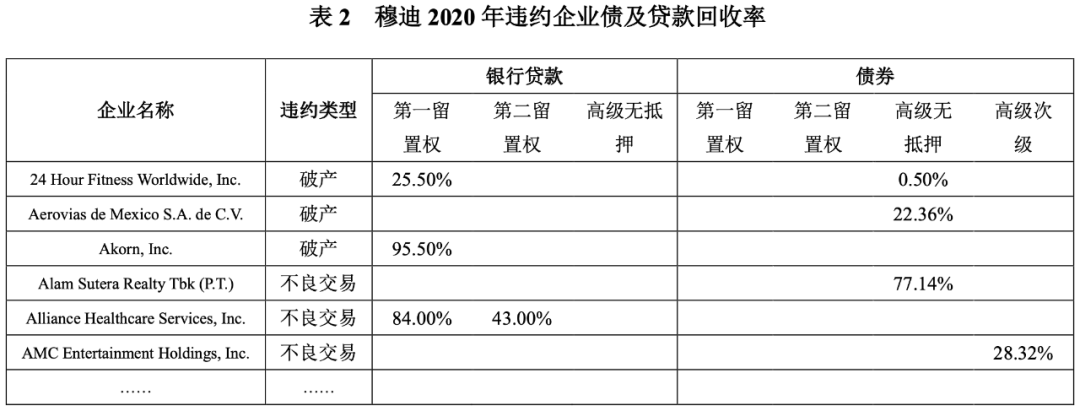 其次,穆迪年度違約和回收率報告的附件中,還會列示以交易價格衡量的當年各違約企業債及貸款的回收率。以2020年度報告為例(詳見表2),本年違約企業24 Hour Fitness Worldwide, Inc的以交易價格衡量的高級無抵押債券的回收率為0.50%。