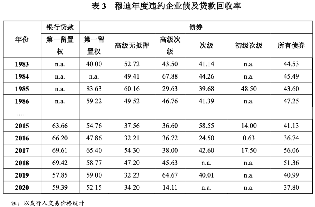 此外,報告附件中還列示了從1983年以來違約企業債及貸款的年度回收率水平。以2020年度報告為例(詳見表3),2020年基于交易價格的高級無抵押債券的回收率水平為34.20%。