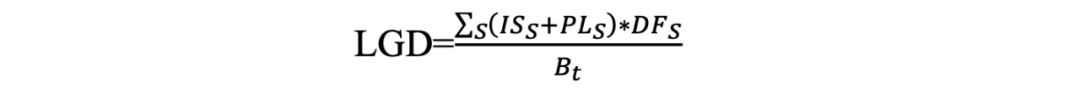 穆迪指出在結構金融產品中LGD的計算公式[5]為,凈損失現值的總和(包括利息和本金損失)以債券的票面利率折現,并除以某一特定日期的本金余額,即: