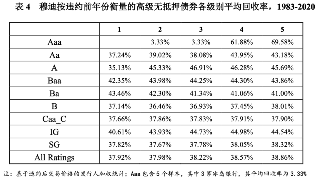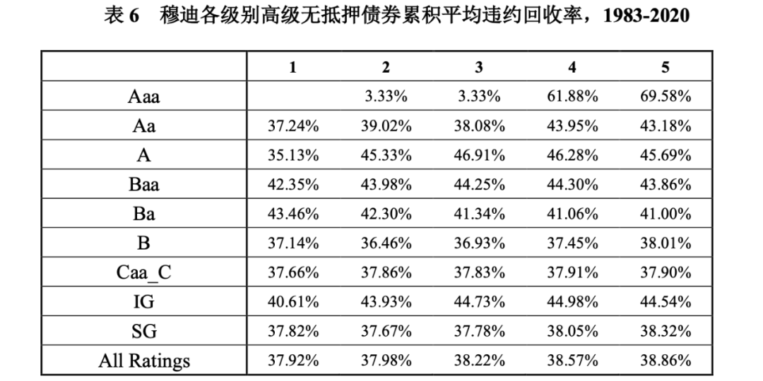 根據穆迪公開資料顯示,平均違約回收率是指特定信用級別的債務工具多年期平均違約回收水平。以2020年度報告為例,表4列出高級無抵押債券在違約前一年至前五年對應的信用級別的平均回收率,違約前2年為B級別的平均回收率為36.46%,是指違約兩年前為B級的高級無抵押債券在兩年內一定時間的平均回收率水平為36.46%。