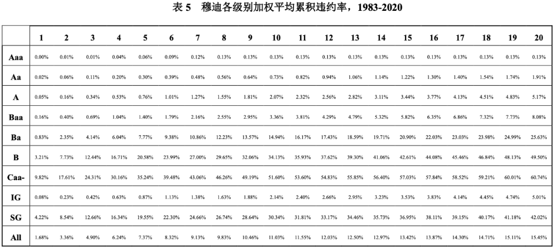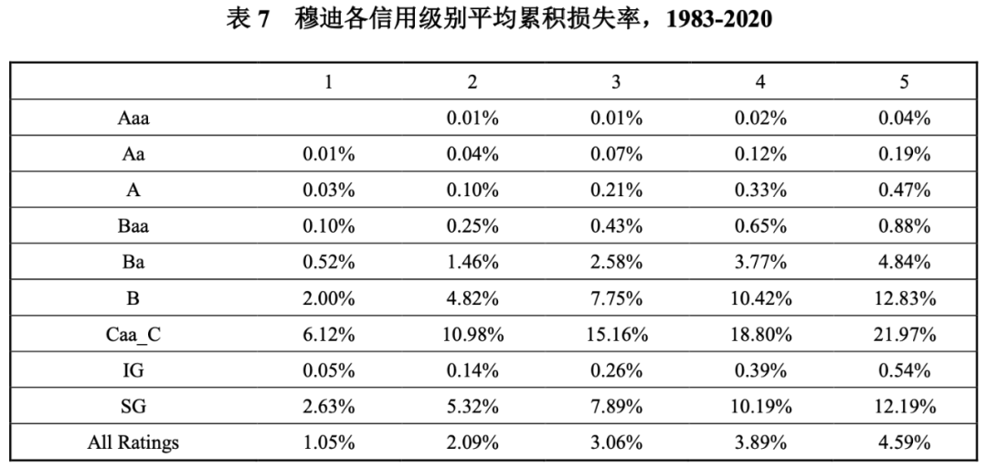 違約損失率信息披露方面,穆迪在其年度違約和回收率報告的附件中,列示了從1983年至當年的平均累積信用損失率,以2020年度報告為例,根據表5和表6的數據得出表7中平均累積損失率的數據。