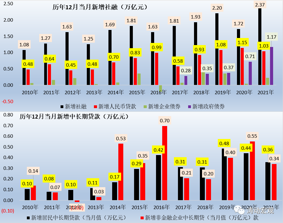 (一)2021年12月當(dāng)月,新增社融達(dá)2.37萬(wàn)億元,同比多增0.65萬(wàn)億,主要由企業(yè)債券(同比多增0.18萬(wàn)億元)和政府債券(同比多增0.46萬(wàn)億元)貢獻(xiàn)。債券同比多增的因素主要有兩個(gè),政府債券是因?yàn)榈胤秸?0-11月放量發(fā)行,企業(yè)債券則是由于去年11月受河南永煤事件影響導(dǎo)致同期基數(shù)較低。