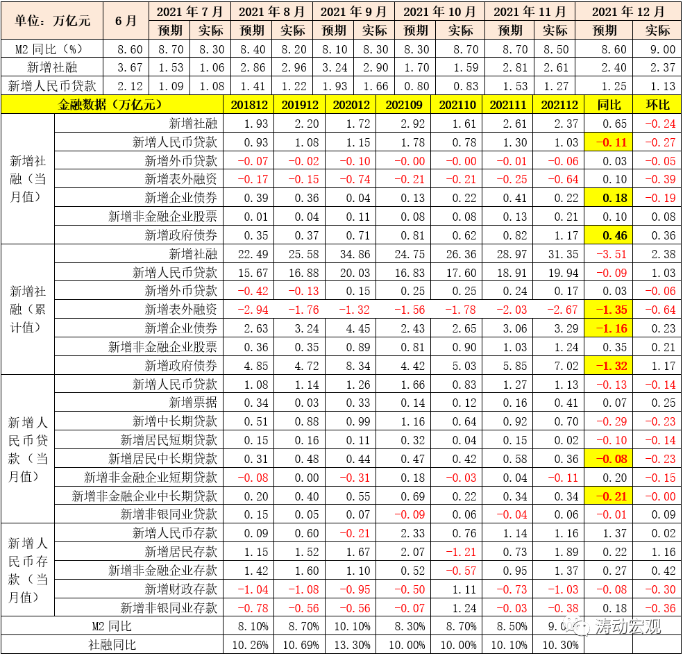 2021年12月,M2同比增速高達(dá)9%,較前值和預(yù)期值分別高出0.50個(gè)百分點(diǎn)和0.40個(gè)百分點(diǎn),社融增速環(huán)比上升0.20個(gè)百分點(diǎn)至10.30%。但是12月當(dāng)月新增社融與新增信貸數(shù)據(jù)繼續(xù)低于預(yù)期,實(shí)際值分別較預(yù)期值0.03個(gè)萬(wàn)億元和0.12萬(wàn)億元,延續(xù)著11月實(shí)際值低于預(yù)期值的態(tài)勢(shì),表明經(jīng)濟(jì)基本面并不樂(lè)觀,目前市場(chǎng)信心依然不足,宏觀政策層面需要更有作為來(lái)穩(wěn)預(yù)期、穩(wěn)信心。