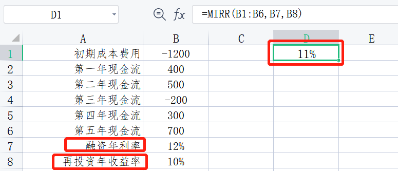 MIRR使用的方式是將期間所有的現金流入,全部以『再投資利率』計算終值FV。期間所有的現金流出,全部以『融資利率』計算現值PV。那么MIRR的公式:=(FV/PV)1/n - 1