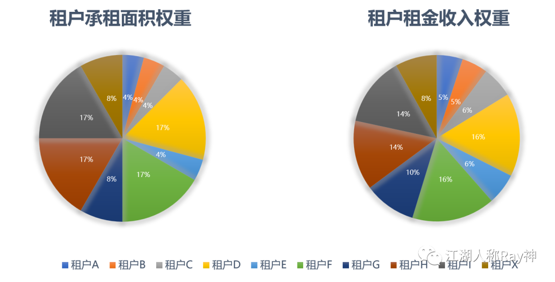 由于加權(quán)平均剩余租期衡量的是項(xiàng)目整體租賃收益的穩(wěn)定性,因此它所使用的權(quán)重,就必須是可用于評價租戶對整體收益影響程度的指標(biāo)。這方面的指標(biāo)通常來說同樣也就是面積和租金收入了——基于面積,是因?yàn)椴煌鈶舻某凶饷娣e不同,對樓宇未來的出租情況影響程度不同;基于租金收入,是因?yàn)樽鈶舫凶鈫蝺r存在差異,承租面積不能完全代表租戶對樓宇租賃收益的影響程度,租金收入才是更完整的體現(xiàn)。