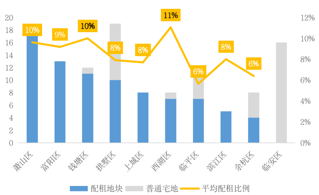 核心板塊優質宅地深度捆綁配建也是杭州租賃供應的典型特征。杭州市區中除臨安外,其余區域的出讓地塊大部分均有配建公租房要求,其中富陽、上城、濱江等區域出讓地塊更是全部要求配建公租房。