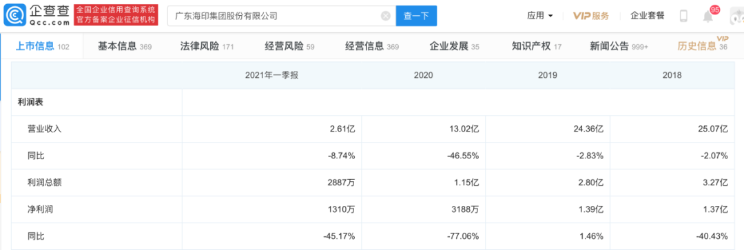 根據企查查,2018年以來,海印股份業績出現不同程度下降,2020年營收13.02億元,同比下降46.55%;凈利潤0.32億元,同比下降77.06%。截至2021年一季度,營收2.61億元,同比下降8.74%;凈利潤0.13億元,同比下降45.17%。