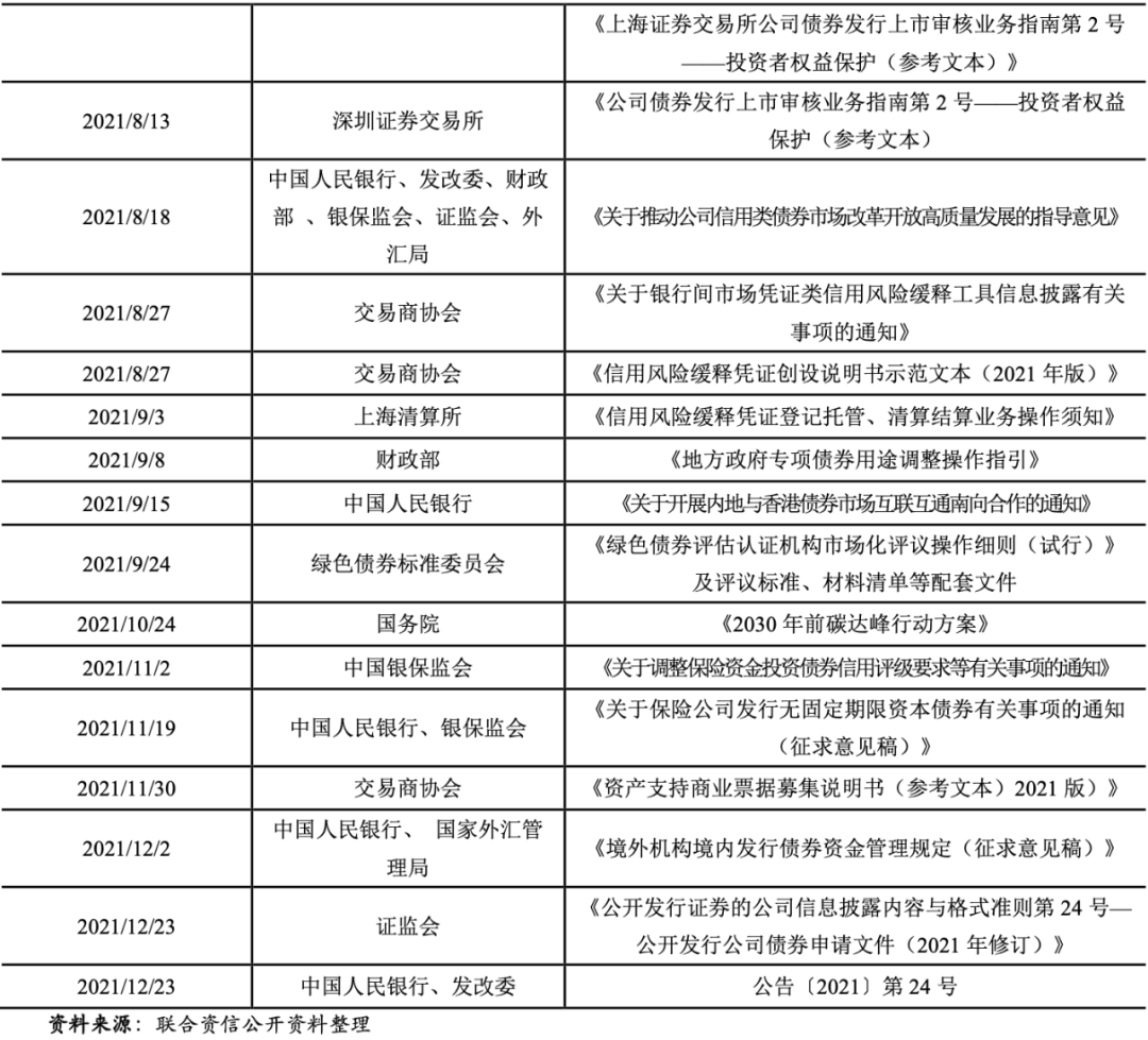 2021年,我國(guó)經(jīng)濟(jì)持續(xù)穩(wěn)定恢復(fù),但仍面臨需求收縮、供給沖擊、預(yù)期轉(zhuǎn)弱三重壓力,同時(shí),外部環(huán)境更趨復(fù)雜嚴(yán)峻和不確定,經(jīng)濟(jì)下行壓力有所較大。在此背景下,監(jiān)管部門(mén)出臺(tái)多項(xiàng)舉措,支持綠色、科技等領(lǐng)域債券定向擴(kuò)容,完善債市體制機(jī)制,推進(jìn)債券市場(chǎng)統(tǒng)一監(jiān)管,加快債券市場(chǎng)對(duì)外開(kāi)放,推動(dòng)信用評(píng)級(jí)行業(yè)高質(zhì)量發(fā)展,持續(xù)加強(qiáng)債券市場(chǎng)風(fēng)險(xiǎn)管控,完善違約處置機(jī)制。總體來(lái)看,我國(guó)債券市場(chǎng)債券高質(zhì)量發(fā)展穩(wěn)步推進(jìn),市場(chǎng)化、法治化、國(guó)際化程度顯著提升。