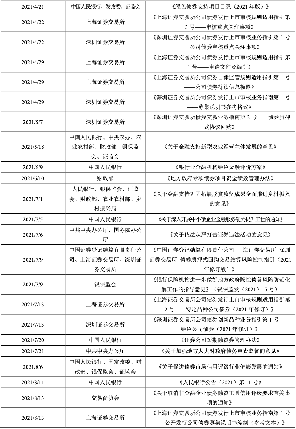 規(guī)范創(chuàng)新債券市場(chǎng)發(fā)展。一是完善綠色債券和鄉(xiāng)村振興債券發(fā)行規(guī)則。7月13日,滬深交易所分別發(fā)布《上海證券交易所公司債券發(fā)行上市審核規(guī)則適用指引第2號(hào)——特定品種公司債券(2021年修訂)》《深圳證券交易所公司債券創(chuàng)新品種業(yè)務(wù)指引第1號(hào)——綠色公司債券(2021年修訂)》等業(yè)務(wù)指引,進(jìn)一步提高了綠色公司債券募集資金使用要求,確保募集資金用于綠色產(chǎn)業(yè)領(lǐng)域;新增“碳中和綠色公司債券”等綠色債券子品種的募集資金用途及信息披露要求指引;將原“扶貧公司債券”整體修訂為“鄉(xiāng)村振興公司債券”,明確了鄉(xiāng)村振興公司債券發(fā)行主體、募集資金用途及信息披露等相關(guān)安排。本次修訂有助于進(jìn)一步完善公司債券創(chuàng)新品種規(guī)則體系,規(guī)范創(chuàng)新債券市場(chǎng)發(fā)展。二是規(guī)范綠色債券評(píng)估認(rèn)證。9月24日,綠標(biāo)委發(fā)布《綠色債券評(píng)估認(rèn)證機(jī)構(gòu)市場(chǎng)化評(píng)議操作細(xì)則(試行)》及配套文件,從綠標(biāo)委對(duì)評(píng)估認(rèn)證機(jī)構(gòu)實(shí)施市場(chǎng)化評(píng)議和自律管理、市場(chǎng)化評(píng)議流程等方面規(guī)范評(píng)估認(rèn)證機(jī)構(gòu)行為,是國(guó)內(nèi)首份針對(duì)綠色債券評(píng)估認(rèn)證機(jī)構(gòu)的自律規(guī)范文件,有助于提高評(píng)估認(rèn)證質(zhì)量,推動(dòng)綠債市場(chǎng)健康發(fā)展。