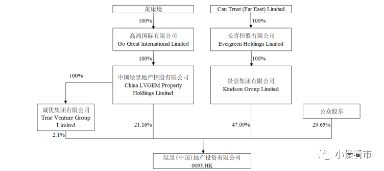 從股權結構看,綠景中國的控股股東為景崇集團有限公司,持股比例為47.08%,實際控制人為自然人黃康境。