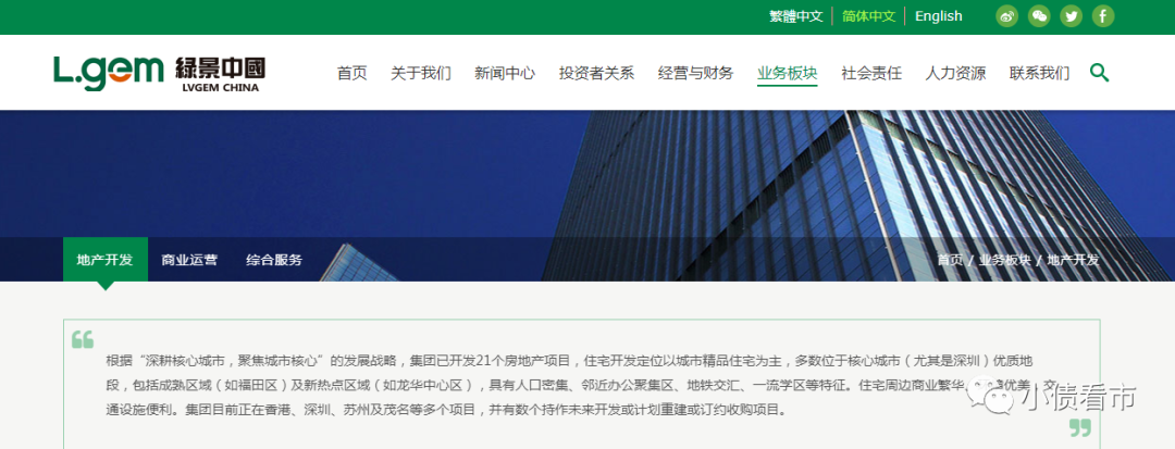 據官網介紹,綠景中國成立于1995年,是深圳公認知名的綜合性房地產開發及商業物業運營商。