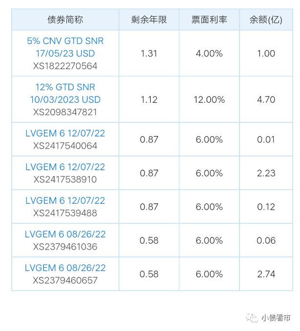 去年12月,綠景中國聯合發行三筆不同貨幣的境外債券,發行額分別為22295萬港元、1150萬美元和100萬人民幣,票息為6%,期限364日,均將于2022年12月8日到期。