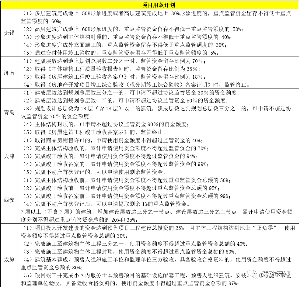 3、預(yù)售資金監(jiān)管的期限一般自核發(fā)商品房銷售許可證開始,至辦理不動(dòng)產(chǎn)首次登記后止。同時(shí),在預(yù)售監(jiān)管資金的使用上,一般會(huì)按照工程進(jìn)度的節(jié)點(diǎn)差異化監(jiān)管,主要的工程節(jié)點(diǎn)有地上“正負(fù)零”、地上1/3、地上1/2、地上2/3、主體封頂、二次結(jié)構(gòu)完成以及取得《建設(shè)工程竣工驗(yàn)收報(bào)告》、《建設(shè)工程外裝修核驗(yàn)記錄》、《建設(shè)工程竣工驗(yàn)收備案證》、完成不動(dòng)產(chǎn)首次登記等等。