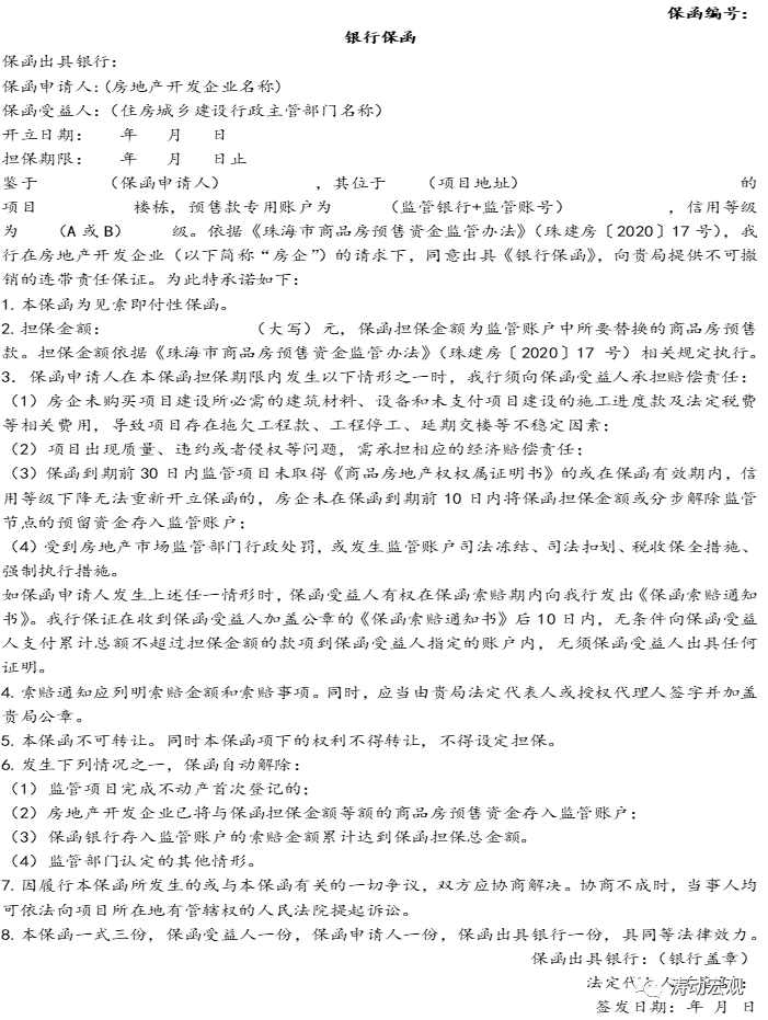2、珠海在保函方面的規(guī)定比較詳細(xì)。具體看,珠海明確地產(chǎn)開發(fā)企業(yè)及其控股企業(yè)連續(xù)3個(gè)年度內(nèi)未受到住建部門行政處罰,且未發(fā)生監(jiān)管賬戶司法凍結(jié)、司法扣劃、稅收保全措施或強(qiáng)制執(zhí)行措施的,可憑銀行保函等額替換與其誠信等級相應(yīng)額度的商品房預(yù)售資金。商品房預(yù)售資金撥付時(shí),