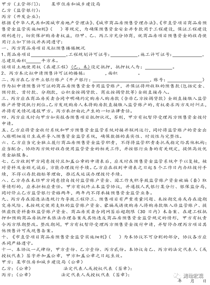 同時(shí),監(jiān)管銀行通常還需要與當(dāng)?shù)刈〗ú块T簽訂預(yù)售資金監(jiān)管合作協(xié)議。