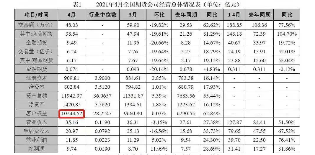 根據中國期貨業協會最新發布的數據顯示,截止到4月底,期貨市場客戶權益金額已達到了10,243.52億元,這是期貨歷史上首次突破萬億元大關。