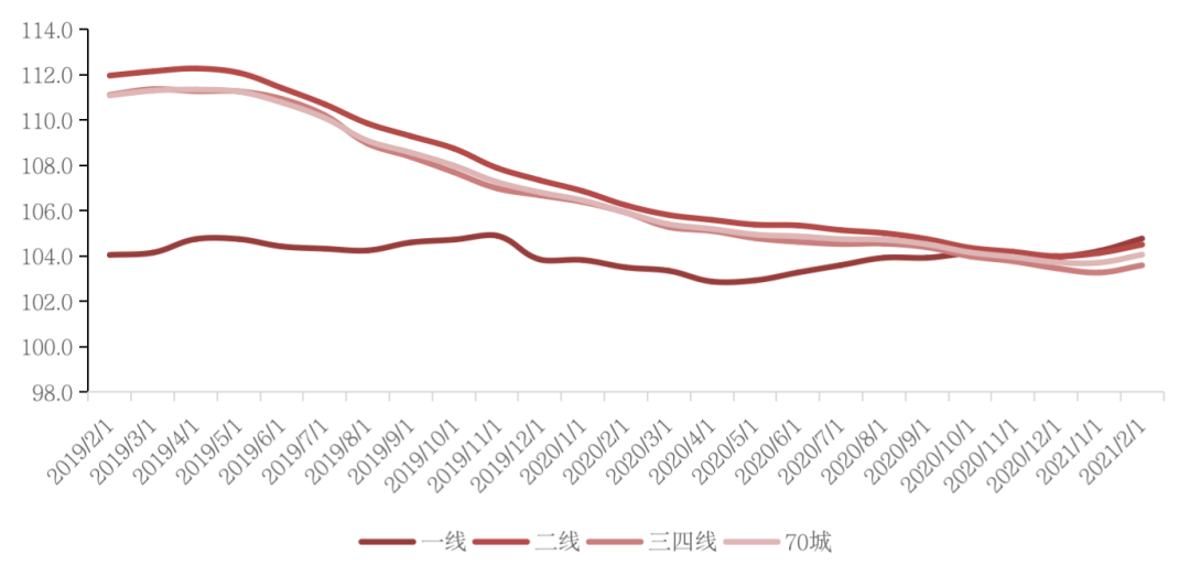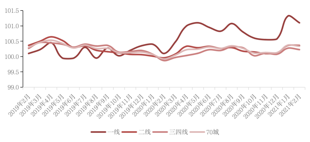 圖:2019年2月-2021年2月70城及各能級城市新建商品住宅價格指數(shù)環(huán)比走勢