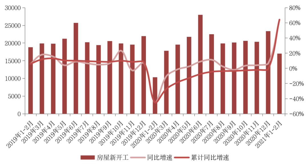 國家統(tǒng)計局?jǐn)?shù)據(jù)顯示,2021年1-2月房屋新開工面積17037萬平方米,同比增長64.3%,相較2019年同期下降9.4%。融資三道紅線約束下,房企融資依然承壓,多以搶施工、促回款為第一要務(wù),相較而言,新開工意愿不足。