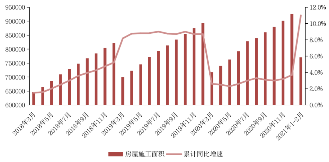 實際上,前2月房地產(chǎn)投資的主要支撐在于施工環(huán)節(jié)。1-2月,房地產(chǎn)開發(fā)企業(yè)房屋施工面積770629萬平方米,同比增長11.0%,相較2019年增長14.2%,房企加快施工進(jìn)度搶占春節(jié)等營銷節(jié)點,支撐房地產(chǎn)開發(fā)投資保持較快增長。考慮到“三道紅線”影響,開發(fā)投資增速大幅上漲可能性不大,預(yù)計今年將呈平穩(wěn)上升走勢。
