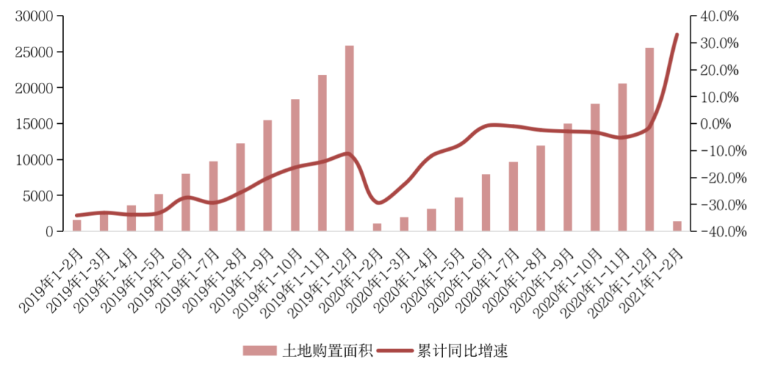 前2月,房地產(chǎn)開發(fā)投資同比增長38%,較2019年同期增長14%,并創(chuàng)下歷史同期新高。與此同時,由于土地供應(yīng)明顯縮量,新開工面積和土地購置面積皆不及2019年同期。