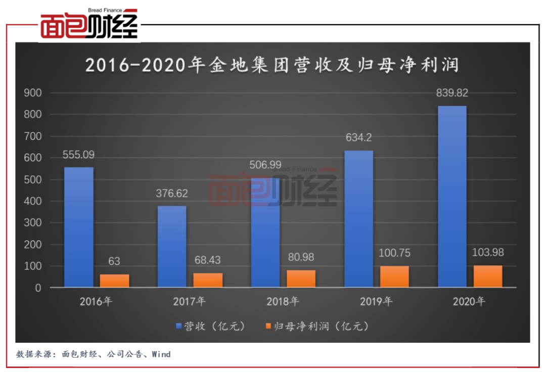 金地集團2020年年報顯示,公司當年實現(xiàn)營收839.8億元,同比增長32.6%;實現(xiàn)歸母凈利潤103.98億元,同比增長3.2%。