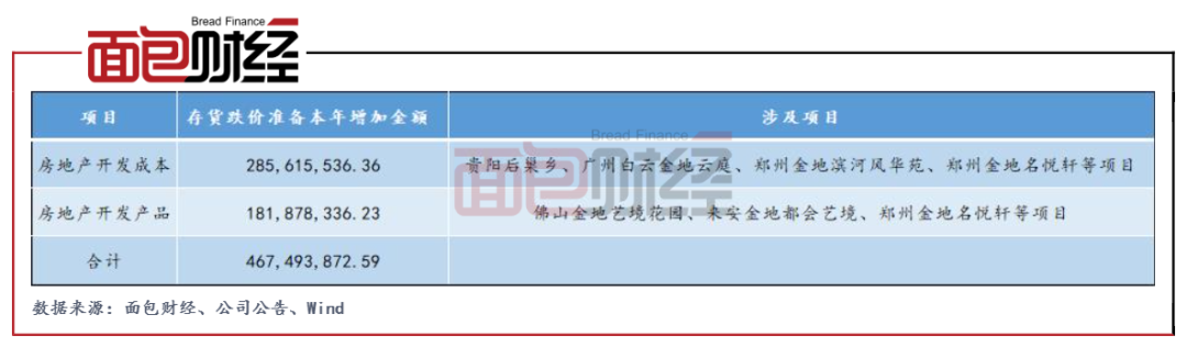 據(jù)披露,公司持有在建開發(fā)成本貴陽后巢鄉(xiāng)、廣州白云金地云庭、鄭州金地濱河風華苑、鄭州金地名悅軒等項目,因可變現(xiàn)凈值低于開發(fā)成本賬面金額,于當年末計提跌價準備約2.9億元;持有開發(fā)產(chǎn)品佛山金地藝境花園、來安金地都會藝境、鄭州金地名悅軒等項目,因可變現(xiàn)凈值低于開發(fā)成本賬面金額,于當年末計提跌價準備約1.8億元。