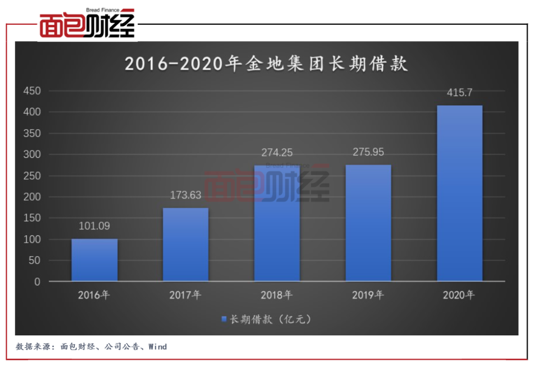 截至2020年末,金地集團負債總額為3075.92億元,同比增長21.84%。其中長期借款415.7億元,同比增長50.64%。長期借款的大幅上漲,或是公司負債率上升的重要原因之一。