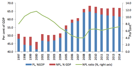在金融危機(jī)時(shí)期,壞賬的增加是有問題的,但卻是可以預(yù)見的。目前情況的不同之處在于不良貸款的持續(xù)存在(例如,參見2016年國(guó)際貨幣基金組織的討論)。1997-98年亞洲金融危機(jī)之后,2000年以來,平均不良貸款率迅速下降;在2008-09年金融危機(jī)之后,平均不良貸款率穩(wěn)步上升(圖1)。